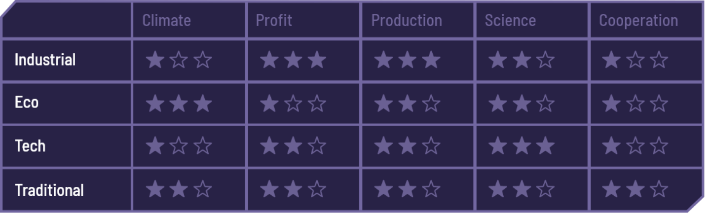 Every faction has different priorities regarding Climate, Profit, Production, Science, and Cooperation, often creating conflicts of interest. The strongest opposing views are between the Eco and the Industrial factions and between the Tech and the Traditional factions. Nevertheless, there can be instances where factions agree and even cooperate.